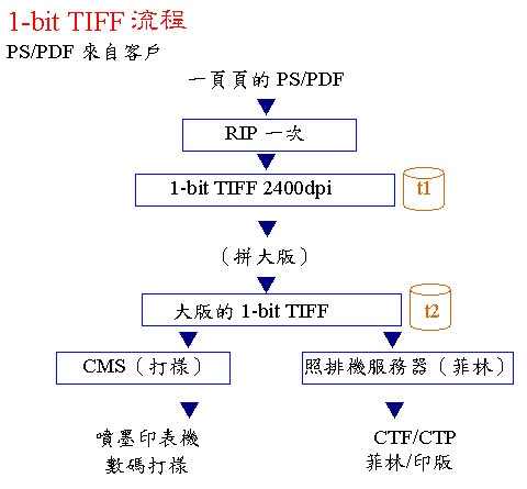 1-bit TIFF 多使用RIP後的影像資料來工作,同樣的,不論是進入實際的流程以前,先將客戶的文件轉成PDF或是PS,這和PDF流程沒以任何差異,不同的是進入流程之後。
