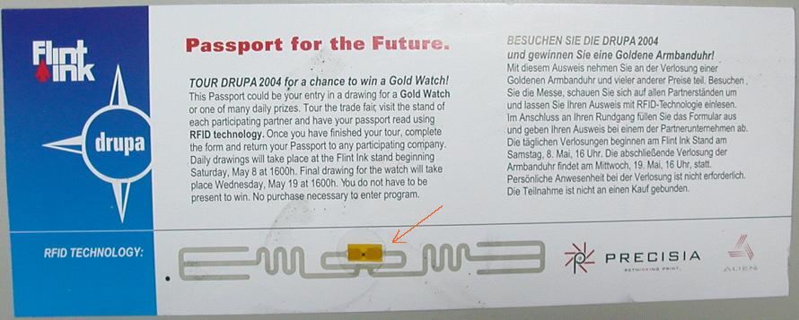 所有包裝盒都是印刷的產品,條碼是印刷時順便印上去的,RFID也一樣。但是RFID需要一塊小小的晶片,粘在用摻了銀粉的油墨印刷的天線上面(參考Flint Ink 在DRUPA 展示的RFID樣本 – Passport for the Future, 紅色箭頭所指的是晶片,兩邊延伸出去的是用銀粉油墨印刷的天線),
